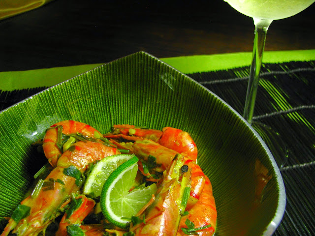 Deixe levantar fervura e adicione os camarões. Tempere com sal e sumo de lima e vá mexendo para que os camarões se envolvam bem no molho. Rectifique os temperos e finalize com salsa picada.
