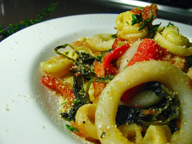 Coza a massa conforme as instruções da embalem até que fique al dente. Entretanto, pique as chalotas e os dentes de alho e refogue-os em azeite numa frigideira. Quando as chalotas estiverem a ficar translucidas, junte os pedaços de pimento e o tomate em cubos e deixe ferver um pouco. Junte as folhas de agrião e vá mexendo até que murchem.