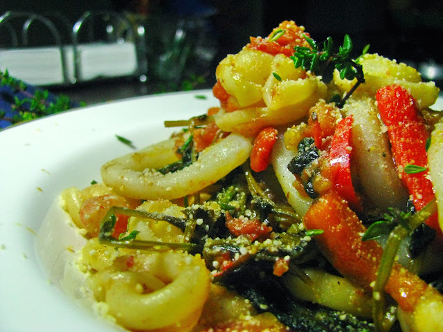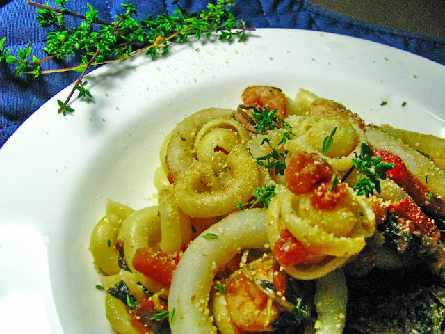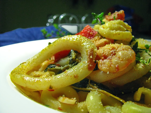 De seguida, adicione o molho de tomate, envolva tudo e tempere com sal e picante a gosto e algumas gotas de sumo de limão (usei 1/2 galego). Quando o molho apurar junte o miolo de camarão envolvendo-o bem no molho. Cerca de 2 minutos após, adicione as argolas de pota. Deixe cozinhar mais 2 a 3 minutos e está pronto a retirar do lume. Escorra a massa e passe-a por água fria para de seguida a juntar à mistura anterior.