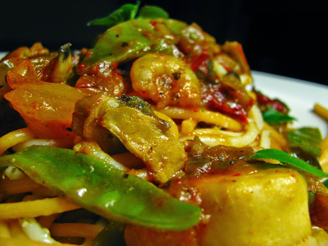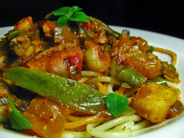 A receita de hoje surgiu graças a umas postas de peixe daquelas zonas menos nobres e que precisavam de ser consumidas. Curgetes nesta altura tenho com fartura e os cogumelos estavam no frigorífico a pedir para serem comidos. Resolvi juntar tudo a uma massa chinesa e dei-lhe um tempero especial que espero ser do vosso agrado...