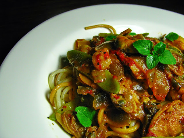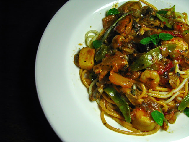 Deixe o molho apurar e adicione o restante marisco e as ervilhas de quebrar. Quando tudo estiver cozido e o molho bem apurado, sirva por cima do esparguete e polvilhe com folhas de oregãos frescos.