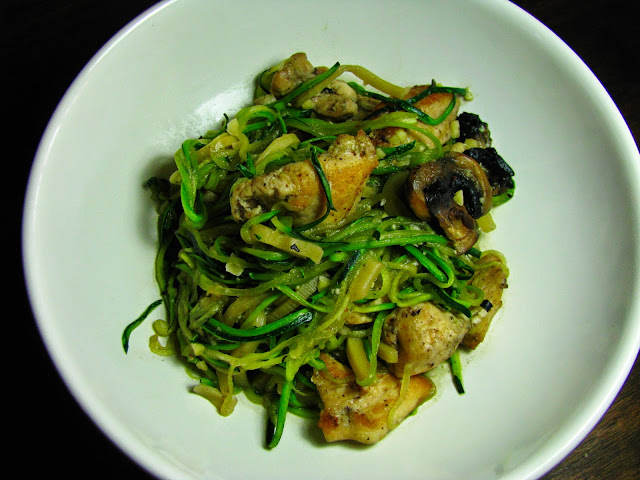 Espiralize as curgetes e lamine os cogumelos.