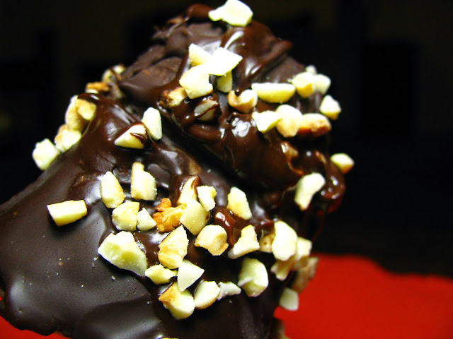 Desenforme os gelados, passe-os pelo chocolate e de seguida polvilhe com o miolo de amêndoa.
