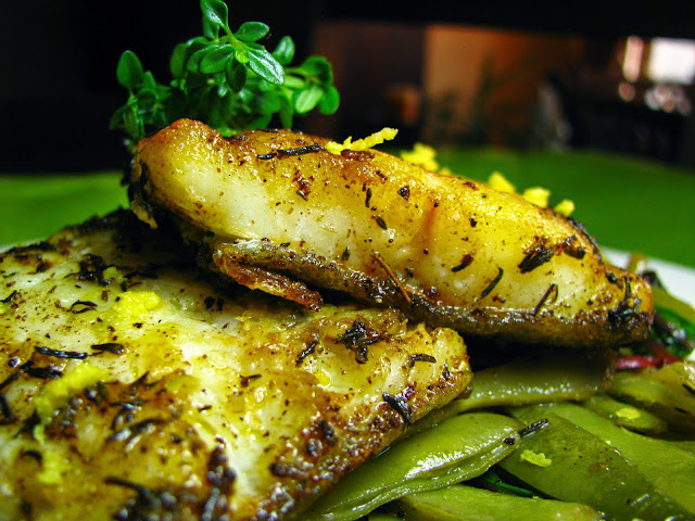 Depois de retirar o peixe, junte um pouco de vinho branco ao molho da frigideira e vá mexendo para que se evapore o álcool e rectifique o tempero. Regue o peixe com este molho ou se preferir sem molho salte este passo.
