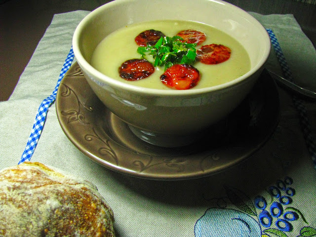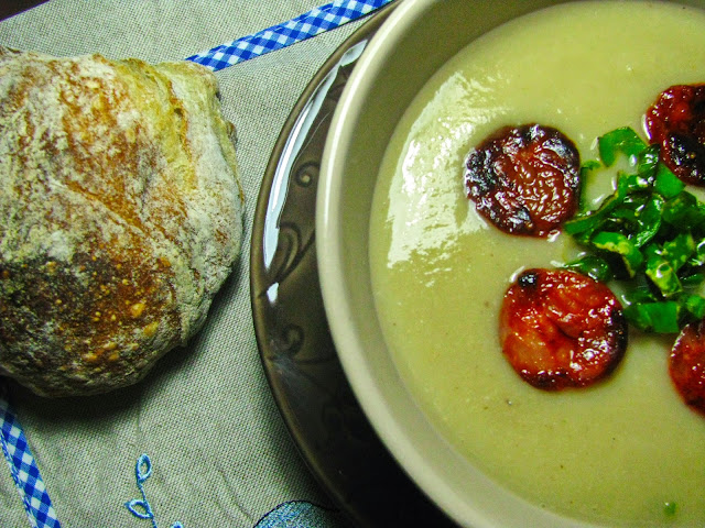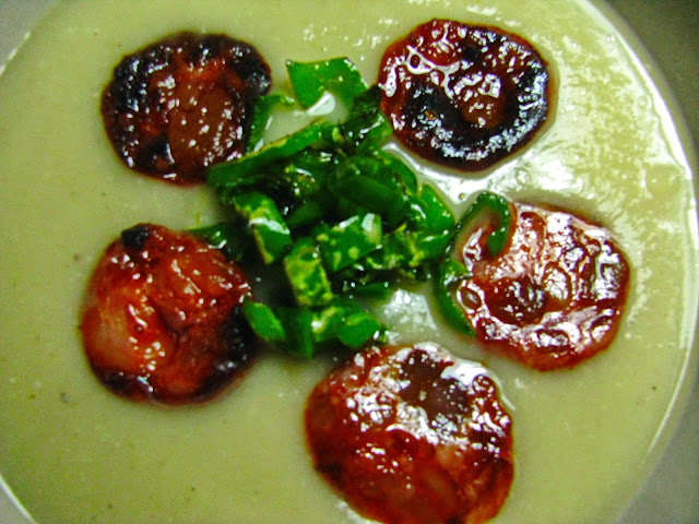 Creme de castanhas com chouriço e pimentos padron